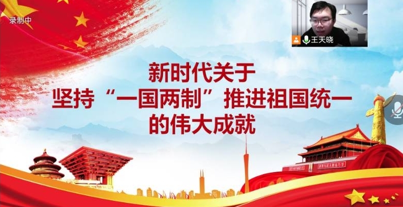 马克思主义学院2020级博士研究生王天晓以《新时代关于“一国两制”和推进祖国统一的伟大成就》为题,向我们系列讲述了党在坚持“一国两制”和推进祖国统一重要方面的新时代中国特色社会主义的伟大成就。