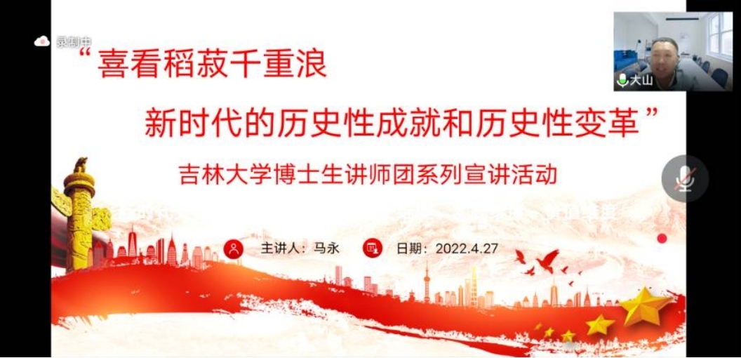 组织全体研究生观看了“喜看稻菽千层浪——新时代的历史性成就和历史性变革”的吉大博士生讲师团线上宣讲系列活动讲座第七讲,由成人抖音