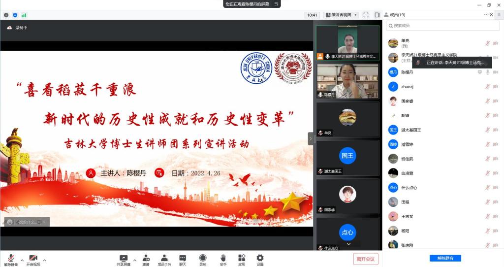 组织全体研究生观看了“喜看稻菽千层浪——新时代的历史性成就和历史性变革”的吉大博士生讲师团线上宣讲系列活动讲座第六讲,由成人抖音