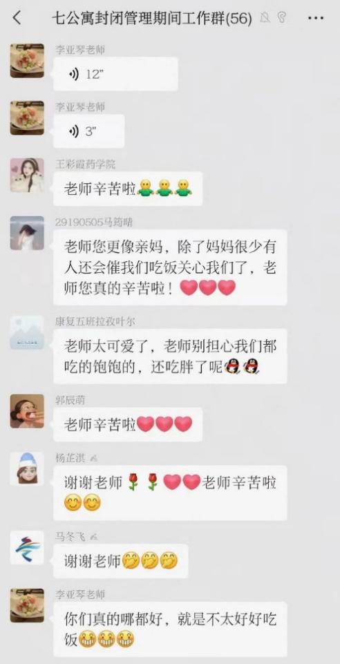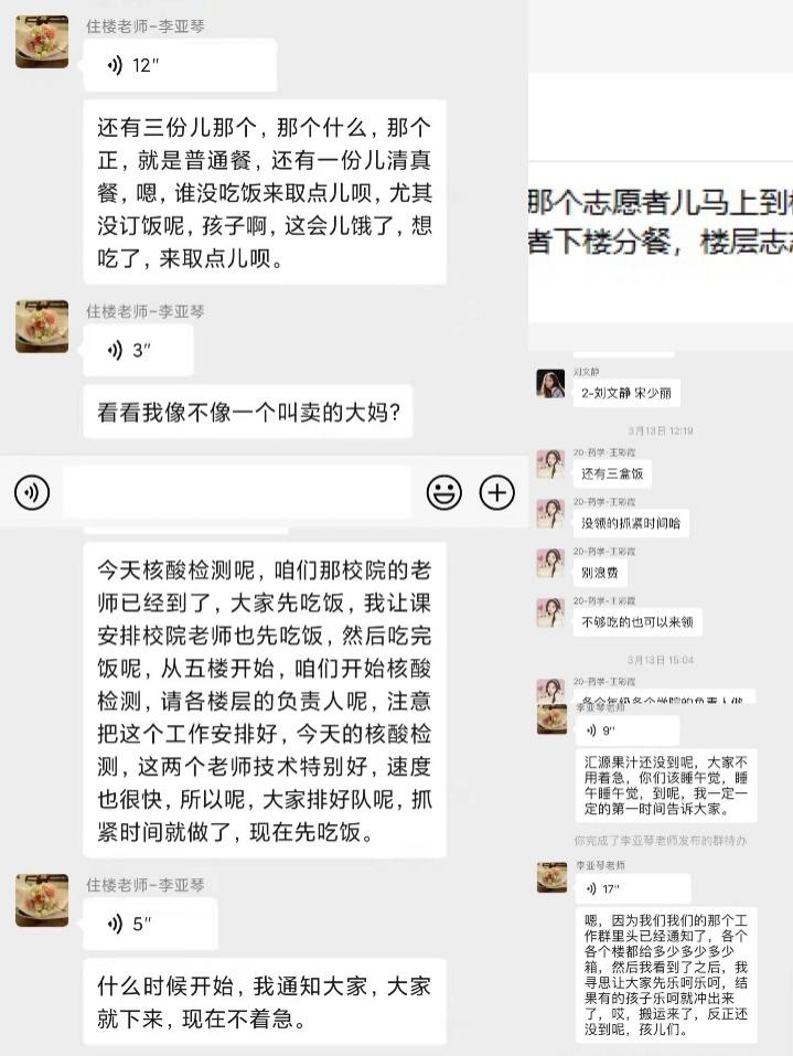 首先,在这段难忘的时光里,让我感受最深的一个人就是我们的驻楼老师李老师。因为我们宿舍在一楼,跟老师的接触比较多,总是可以听见老师忙碌的声音和身影。每天早晨我们还在朦胧中,就听见门外老师繁忙的声音,六点多驻楼老师和宿管阿姨都已经起床去接收早饭,然后准时再在群里发消息让志愿者们准备清点份数,负责分发早饭,有的同学想多睡会,就悄悄把饭放到外面箱子上,有时候遇到好吃点的饭,老师就会提醒大家,让大家先赶紧把饭拿进去,以免凉了就不好吃了。刚吃完早饭,出去上厕所又看见老师在清点防疫物资,不知道老师有没有吃早饭,然后又是一轮分发和提醒大家做抗原,这波刚忙完又要接收午饭,水,学校发的物资,晚饭,核酸检测,生活秩序…如此循环往复。我的脑子里都是驻楼老师忙碌的身影和她常说的一些话语“几楼缺多少个桔子”、“大家谁的饭不够吃或者没订饭还想吃的就来一楼取,一定一定不要客气”、“孩子们你们先睡会觉,等核酸检测来了我叫你们你们再下来”、“孩子们不要减肥了,好好吃饭”、“孩儿们,不要着急,饭马上就到,今天送饭的车在路上出了点故障”…一声孩子们,孩儿们安抚了多少学生们的心啊。很多时候忙完一天工作都要到深夜,还记得有一次我们宿舍晚上一起看恐怖片晚上十二点了出去上厕所,然后碰到李老师,还夸我们深夜出来带口罩很听话,然后又让我们赶紧睡觉别熬夜,多问了两句才知道李老师刚开完会还没洗漱呢,顿时心里非常暖,也非常感动。