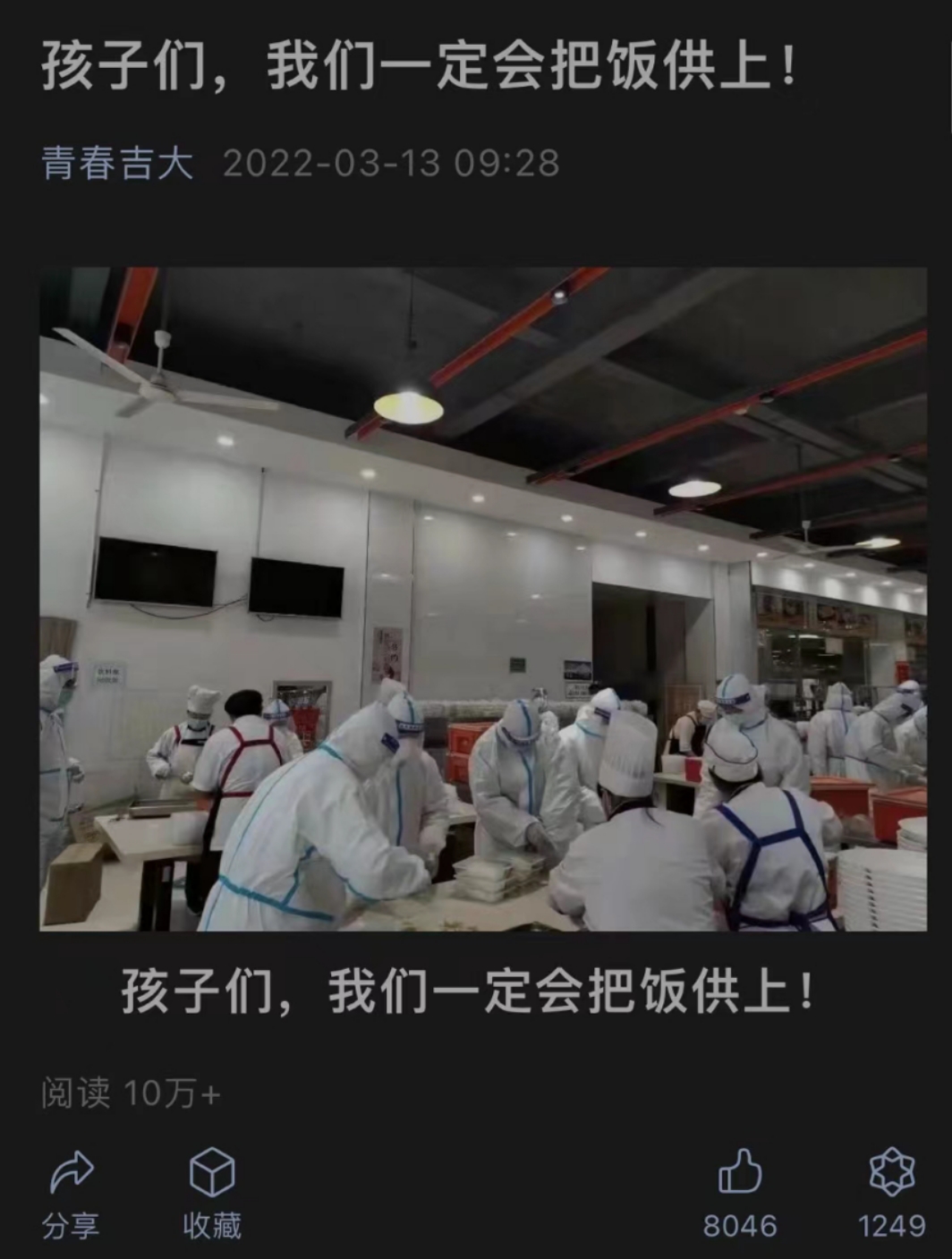 官方公众号发布发的那则《孩子们,我们一定会把饭供上!》中,头戴厨师帽的叔叔阿姨和穿着防护服的工作人员,正在食堂里紧锣密鼓地打包饭菜,由志愿者向各公寓楼的在校生送来三餐。万事开头难,总会遇到各式各样的问题,但学院进行了积极的意见反馈工作,及时了解各公寓楼的实际状况和学生诉求,及时调整,让大家都吃上了学校辛苦提供的热腾腾的饭菜。还有同学打趣说:“以为的隔离生活——没什么可吃的;真实的隔离生活——猪羔子都不敢这么养。”“什么家庭啊一顿四个菜,还带酸奶水果的,解封之日怕不是出栏之时。”每天4万份且能够按时送到每位同学手中的隔离餐,营养丰富又美味;宿舍里随之升腾起来的热气和饭香,都是一个高校对学生最真挚的爱护。