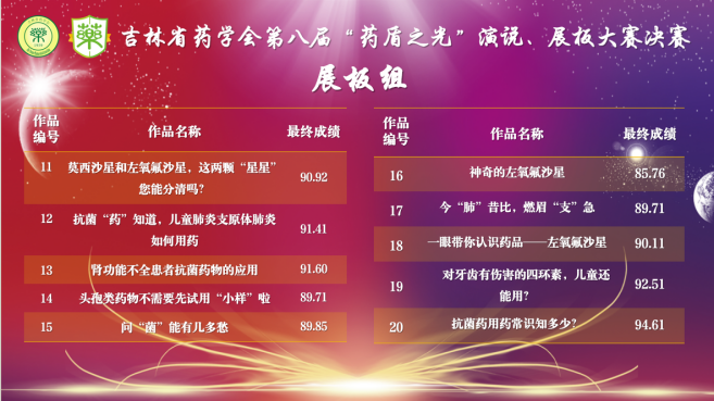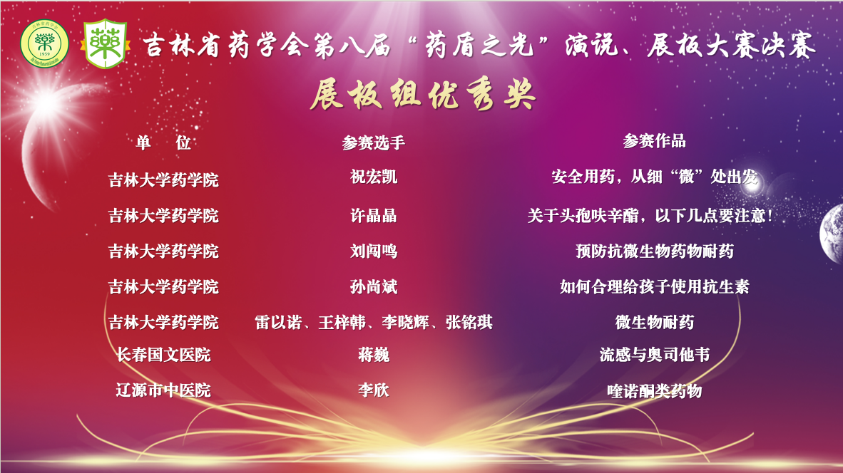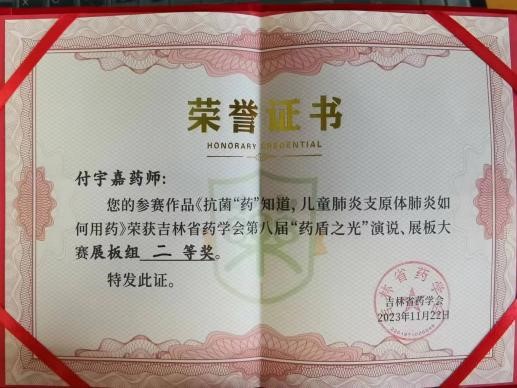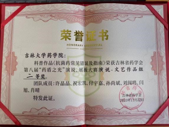 学生积极向上,勇于创新的青春风采。我院2021级临床药学本科生祝宏凯——《安全用药,从细“微”处出发》、许晶晶——《关于头孢头呋辛酯,以下几点要注意!》、刘闯鸣——《预防抗微生物药物耐药》、孙尚斌《如何合理给孩子使用抗生素》、2022级临床药学本科生雷以诺、王梓韩、李晓辉、张铭琪——《微生物耐药》作品,均获展板组优秀奖,展现我院学子科普能力和素养。2022级临床药学本科生雷以诺、王梓韩、李晓辉、张铭琪——《药品安全无小事,合理用药有常识》作品荣获演讲组优秀奖。