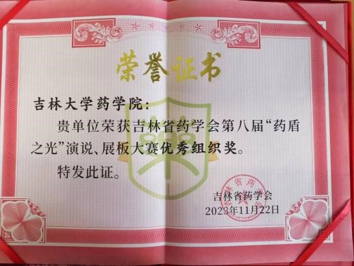 本着“拓展药学实践、培养要学人才”的理念,积极组织和指导临床药学专业学生参赛,取得佳绩。我院21级、22级学生共参赛作品8项,共获展板组二等奖1项,优秀奖5项;演讲组荣获优秀奖1项和文艺作品组荣获二等奖1项,学院荣获“吉林省药学会优秀组织单位”。