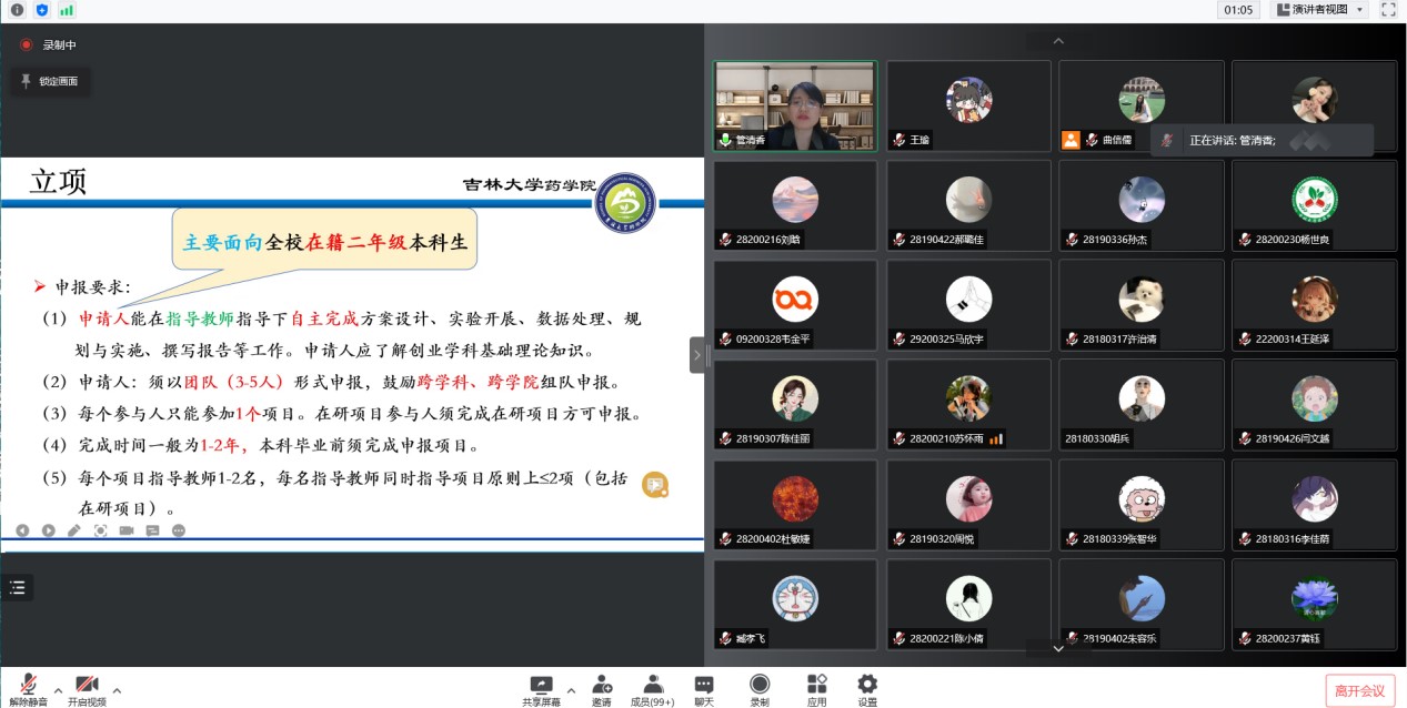 举办大学生创新创业训练计划线上专题指导会。会议由学院教务办主任王瑜主持,教学副院长管清香、教务办全体人员和学院193名本科生参加了会议。