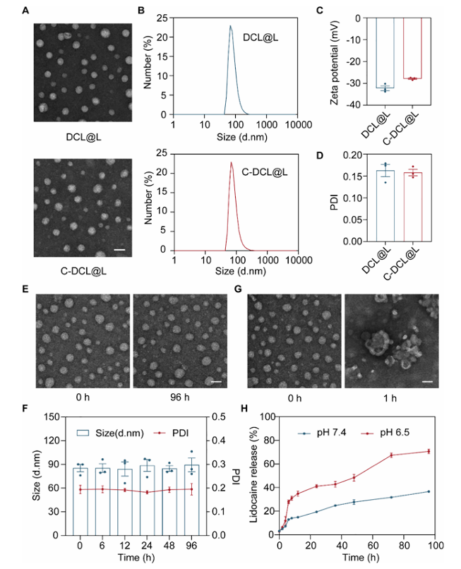 3.性能优化:通过调整DCL与利多卡因质量比至20:1,实现74.96±2.15%的高包封率;CBP修饰后,脂质体粒径从约84.46nm增至88.71nm,zeta电位从-32.27mV升至-27.90mV,且在生理pH 7.4条件下96小时内形态、粒径稳定,在pH 6.5时响应酸性微环境,96小时内利多卡因累积释放率达70.71±2.43%(图 2)。
