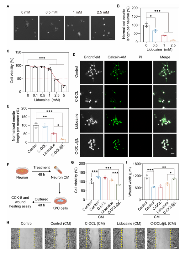 1.神经选择性抑制:神经元对利多卡因的敏感性远高于 PDAC 细胞,0.5 mM 利多卡因可使背根神经节(DRG)神经元轴突长度减少 35%(KPC 细胞 IC50为 2.46 mM);C-DCL@L处理后,神经元突起长度减少 81.5%,且不影响神经元与 KPC 细胞活性(图 3)。