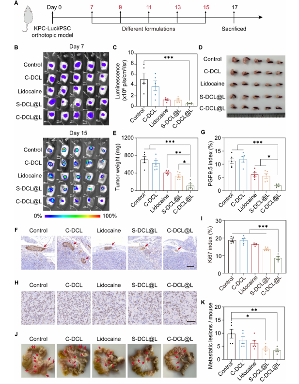 在PDAC原位小鼠模型中,C-DCL@L展现出优异的抗肿瘤与抗转移效果: