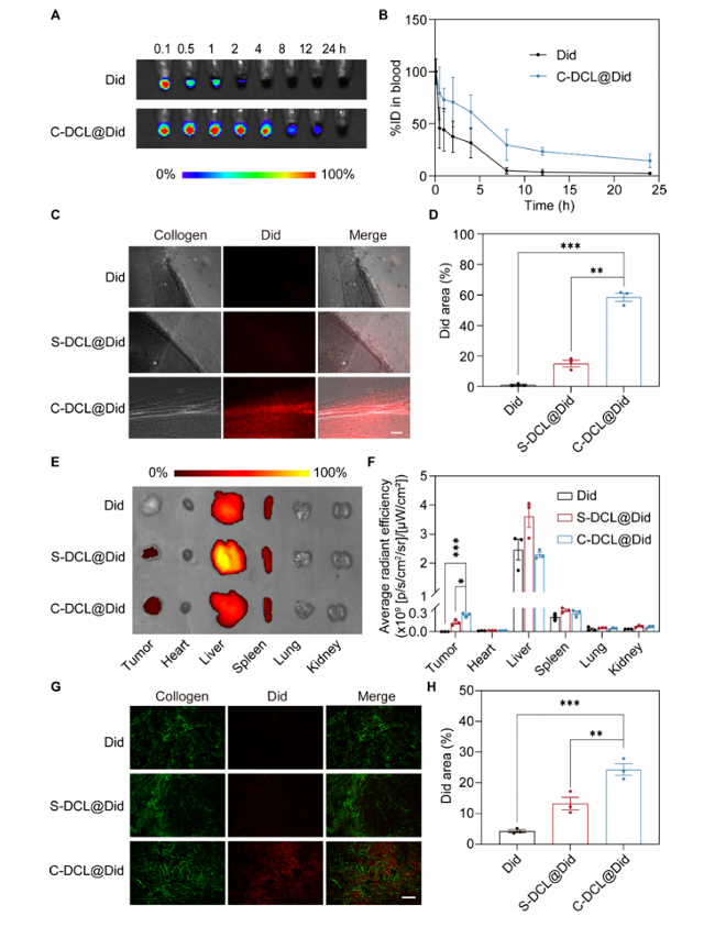 2.在 PDAC 致密微环境中,C-DCL@L 的胶原结合能力使肿瘤内药物累积量显著提升,是游离药物组的5.7倍、非靶向脂质体(S-DCL@L)组的1.8倍,且在给药48小时后仍能检测到肿瘤内药物信号(图 4)。